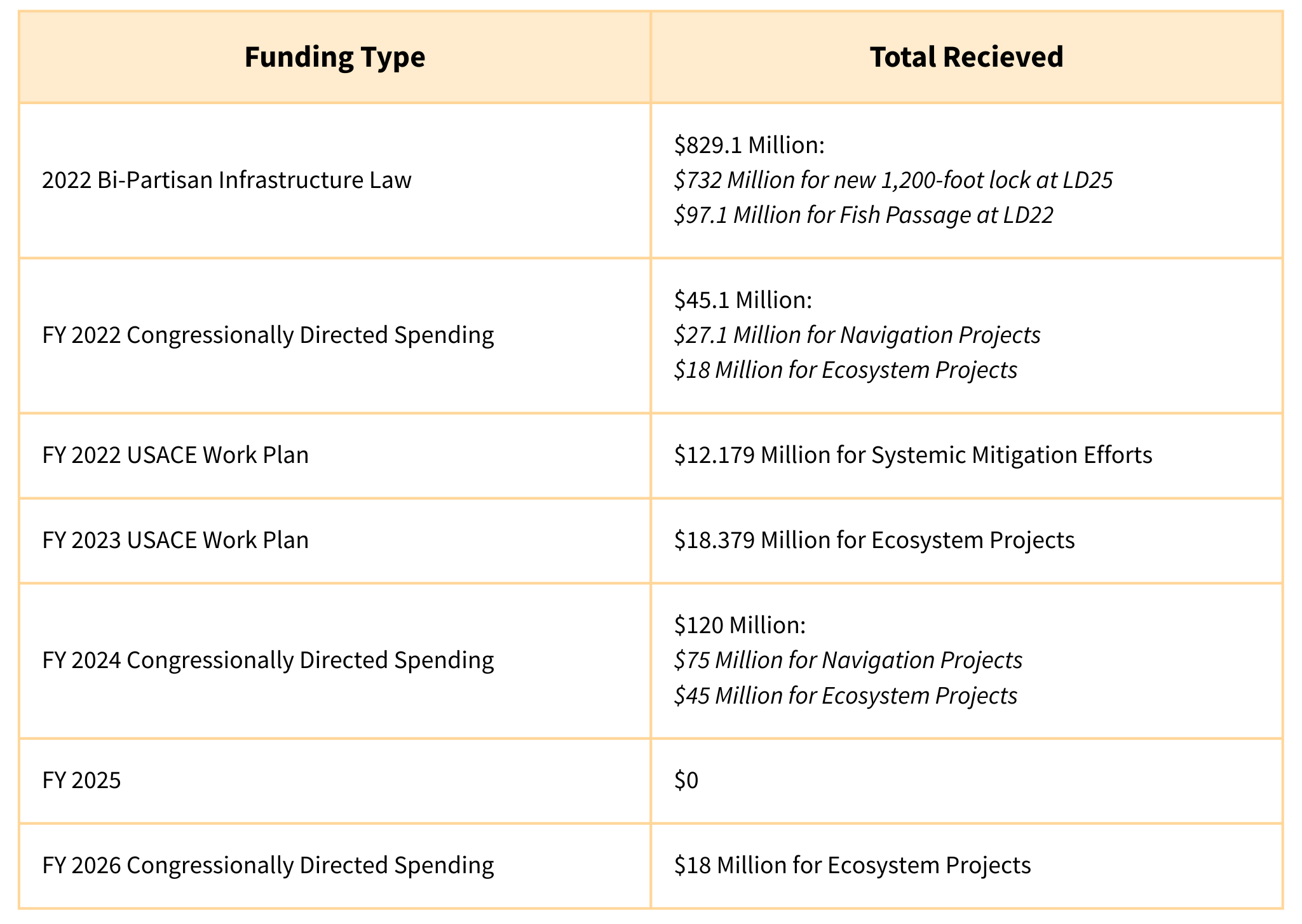 The Lower Mississippi River has not received investment funding for ecosystem restoration like the Upper Mississippi River, despite the Corps’ extensive levee and channel maintenance projects that have fragmented the Lower River’s habitat and caused significant degradation. In 2020, Congress authorized the Corps to conduct the Lower Mississippi River Comprehensive Study to develop recommendations for ecosystem restoration and other purposes. The Lower Mississippi River Comprehensive Study was appropriated $25 million between 2022 - 2027, but funding was recalled by the Trump Administration in Fiscal Year 2025.